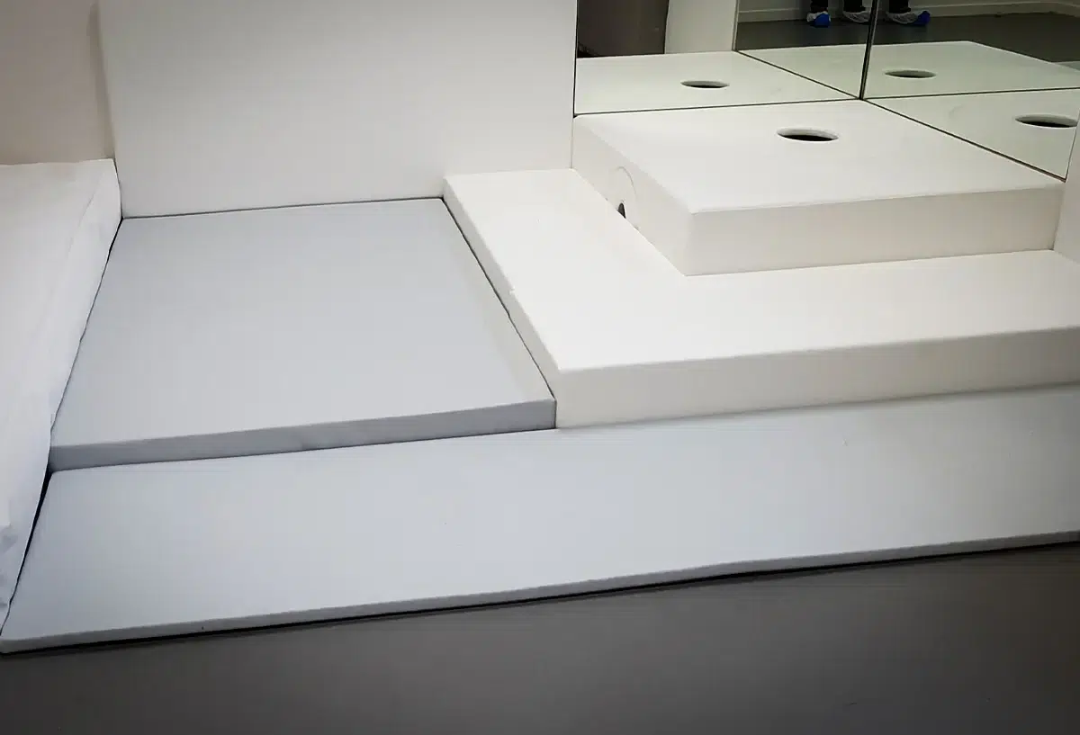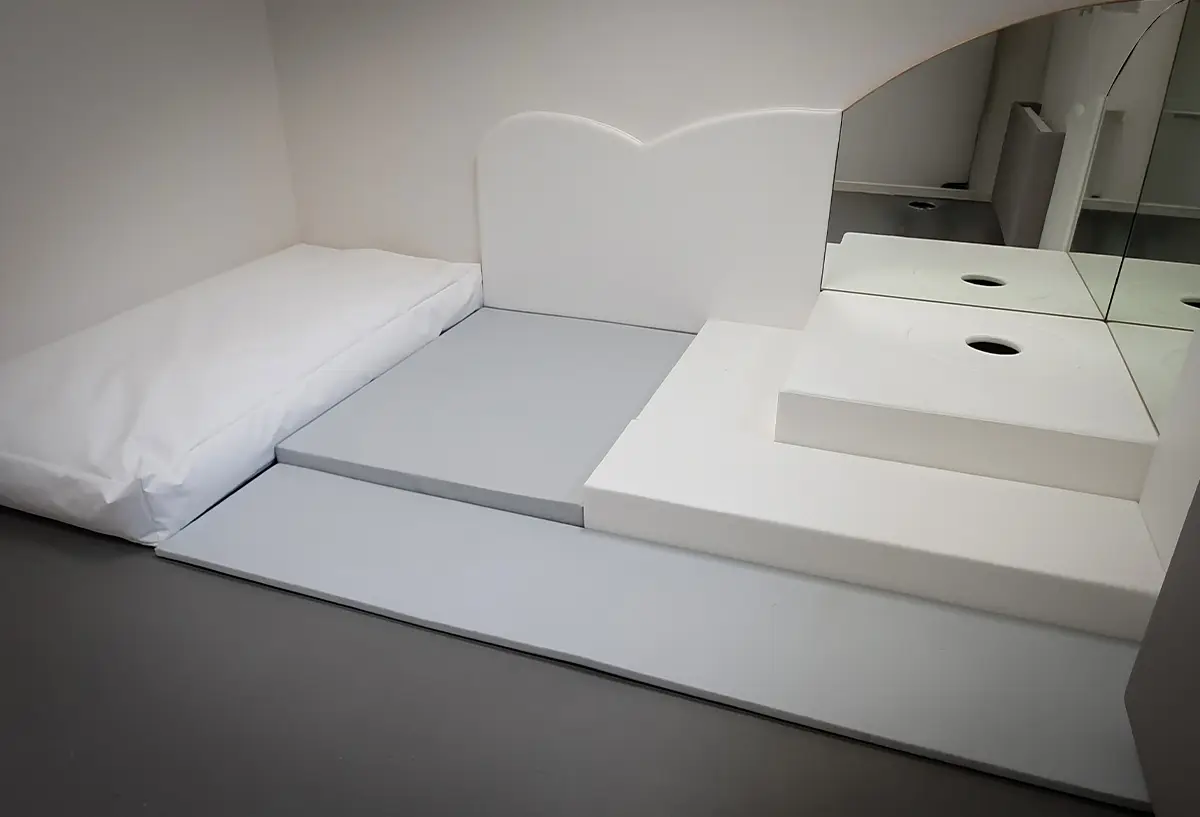 Les aménagements sont composés de différents éléments à choisir en fonction des besoins de la structure : matelas de sol, tapis de différentes épaisseurs, protections murales, coussins douillets, miroirs muraux, supports pour colonne à bulles…