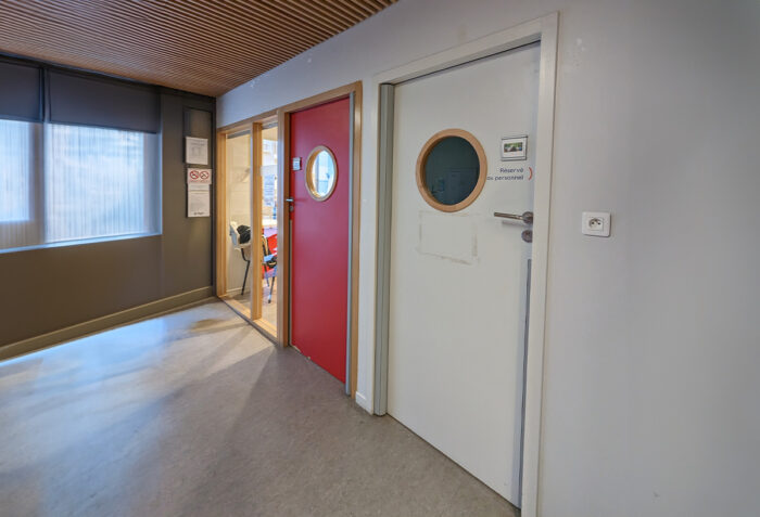 Pour se conformer à la règlementation : « Les portes ouvrant sur les espaces d’accueil d’enfants doivent être équipées d’un oculus grande hauteur ou de deux oculi vitrés dans le haut et le bas de la porte permettant de visualiser les enfants placés de l’autre côté de la porte.»