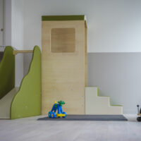 Jolie structure de motricité d’angle composée d’un escalier, d’un toboggan, d’une cabane et d’une plateforme