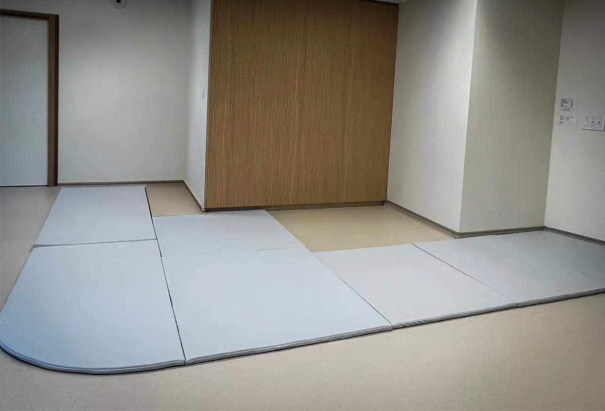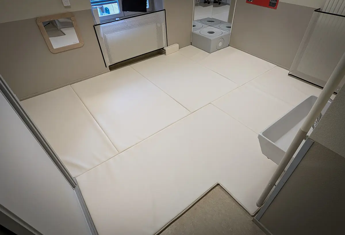 Tapis de recouvrement de sol sur mesure conçus pour couvrir tout ou partie d’une pièce en crèche ou en établissement de santé.